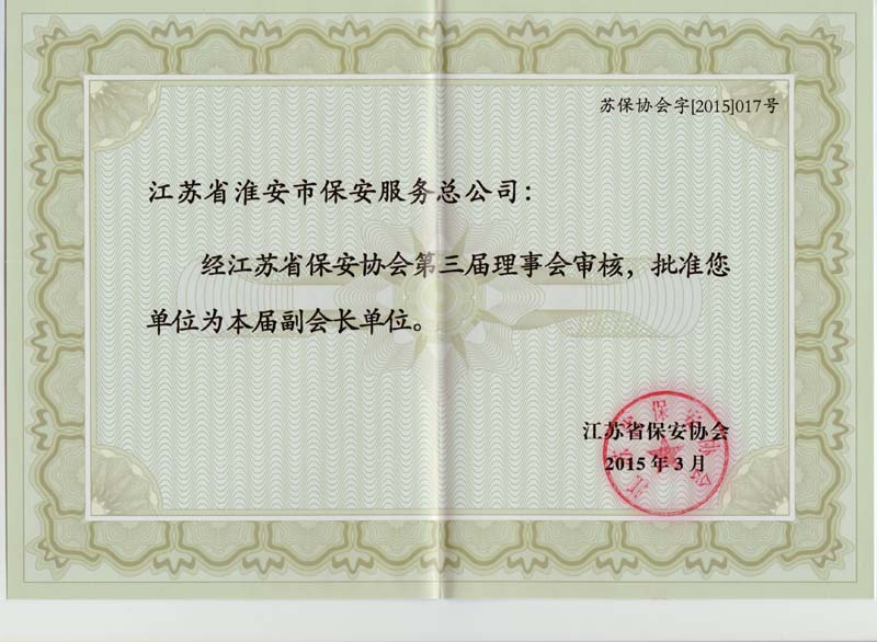 江蘇省保安協(xié)會(huì)第三屆理事會(huì)副會(huì)長(zhǎng)