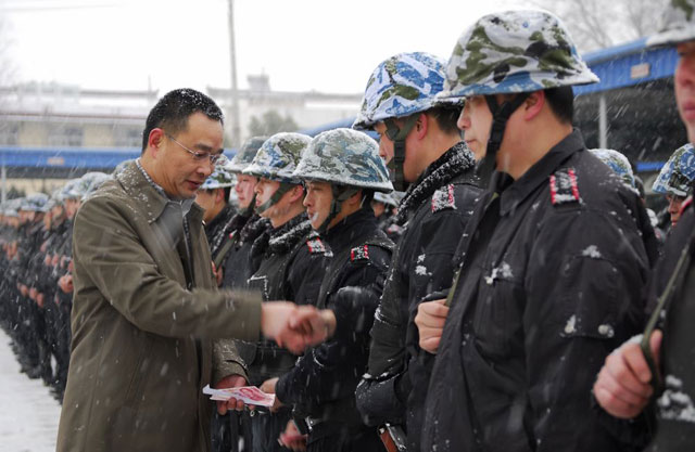 2月14日大年初一上午,總經(jīng)理婁伯翱、副總經(jīng)理王克、徐文剛以及公司黨總支委員、公司各部負責(zé)人一起冒雪慰問了執(zhí)行任務(wù)的武裝押運員,婁伯翱總經(jīng)理代表黨總支向大家拜年并致以節(jié)日的問候和祝福。然后,婁伯翱總經(jīng)理在保安部陪同下,慰問了市國稅局、供電局、易初蓮花超市等人防執(zhí)勤點;副總經(jīng)理王克和徐文剛分別驅(qū)車慰問外派保安隊員。