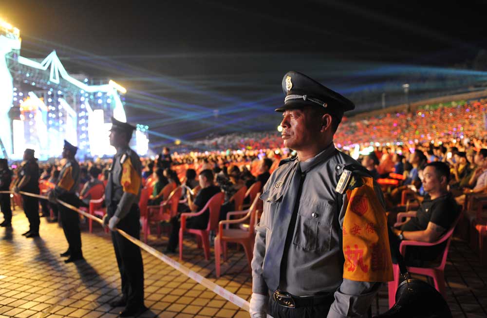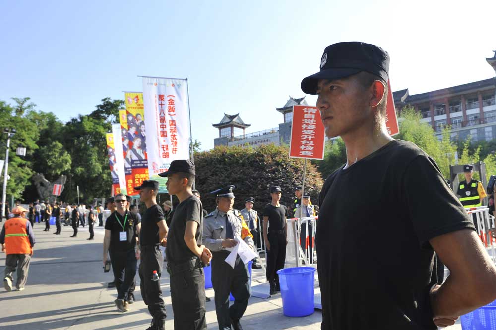 由于晚會(huì)演出現(xiàn)場地處山腰,給安檢和安保工作帶來一定的難度。為確實(shí)做好安保任務(wù),總公司多次召開專項(xiàng)工作會(huì)議,統(tǒng)一部署安保工作,人防中心總監(jiān)王錦春先后帶領(lǐng)領(lǐng)導(dǎo)班子多次到盱眙都梁廣場踏勘現(xiàn)場,熟悉崗位,開展現(xiàn)場拉練,研定安保方案??偣狙杆俪闪⑼頃?huì)票證檢查、安全檢查、搜毒搜爆、秩序維護(hù)、安保巡邏、駐地保衛(wèi)、無人機(jī)監(jiān)控、突發(fā)事件處置組等安保小組,同時(shí)抽調(diào)行政中心、人防中心、押運(yùn)中心、科技公司、器材公司、犬防大隊(duì)、無人機(jī)飛控隊(duì)、保安中專班、銀盾檢測站等部門人員參與安?;顒?dòng)。