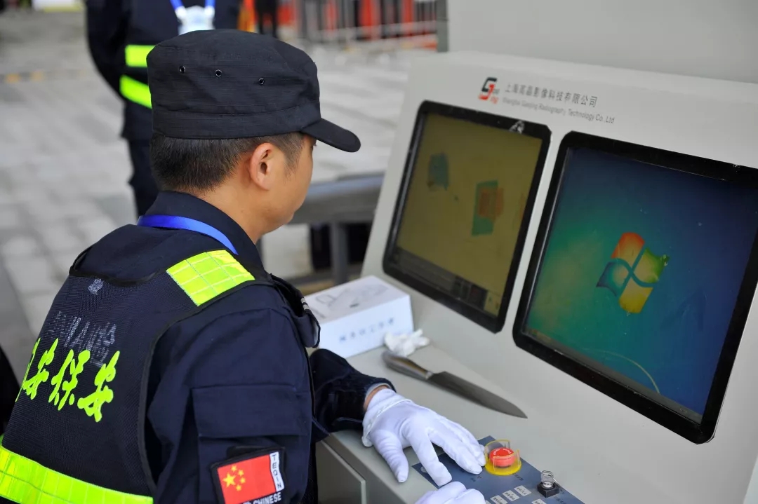 執(zhí)勤人員在安檢口對(duì)包裹進(jìn)行檢查