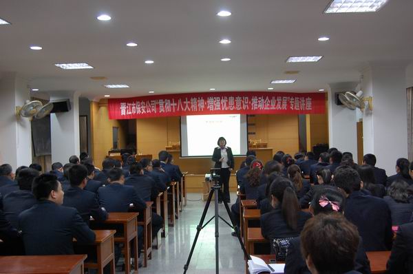 本網(wǎng)-福建省晉江市保安服務(wù)公司消息(通訊員 歐陽長(zhǎng)青) 為進(jìn)一步適應(yīng)日益激烈的市場(chǎng)競(jìng)爭(zhēng),切實(shí)推動(dòng)企業(yè)持續(xù)發(fā)展,3月27日-28日,公司結(jié)合“增強(qiáng)憂患意識(shí),推動(dòng)長(zhǎng)遠(yuǎn)發(fā)展”大討論活動(dòng),舉辦“貫徹黨的十八大精神·增強(qiáng)憂患意識(shí),推動(dòng)企業(yè)發(fā)展”專題講座。晉江市委黨校副教授吳蓮妹應(yīng)邀前來授課。保安公司領(lǐng)導(dǎo)吳輝表、各部門經(jīng)理、工作人員等100多人聆聽了講座。