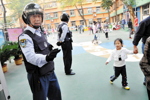 人民網(wǎng)·天津視窗10月11日電:頭頂防暴頭盔,身穿防刺背心,手袋防割手套,腰佩催淚瓦斯和橡膠警棍,天津濱海新區(qū)188所公辦中小學(xué)、幼兒園的保安全部被武裝起來,在上下學(xué)時成為師生們的保護神。