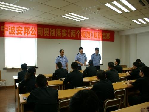 為全面推動寧波安邦護衛(wèi)有限公司學(xué)習(xí)省安邦護衛(wèi)有限公司《兩個規(guī)范》活動向縱深發(fā)展,進一步營造全員參與的濃厚氛圍。2012年5月12日,寧波安邦護衛(wèi)有限公司組織開展“貫徹落實《兩個規(guī)范》知識競賽”活動。公司10支代表隊共49名選手參加了角逐,公司張正逸總經(jīng)理、董國平副總經(jīng)理到競賽現(xiàn)場巡考。
