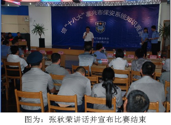 浙江省保安工作消息 為迎接黨的“十八大”順利召開,9月21日下午,浙江省嘉興市保安協(xié)會(huì)在嘉興市公安局人民警察培訓(xùn)學(xué)校舉辦了全市“保安系統(tǒng)知識(shí)競賽”。省公安廳治安總隊(duì)保安科科長、省保安協(xié)會(huì)秘書長傅志方,省公安廳治安總隊(duì)保安科壽俊杰,市保安協(xié)會(huì)常務(wù)副會(huì)長兼秘書長張秋榮,市保安服務(wù)公司總經(jīng)理、市保安協(xié)會(huì)副會(huì)長皇甫玉明等領(lǐng)導(dǎo)蒞臨現(xiàn)場觀摩指導(dǎo)。嘉興市公安局治安支隊(duì)政委潘新華和治安支隊(duì)副支隊(duì)長朱忠華分別致了比賽開幕詞和閉幕詞。由市局特警支隊(duì)政委陸永清等四人組成的評(píng)委團(tuán)對(duì)比賽全程進(jìn)行了監(jiān)督、評(píng)判。