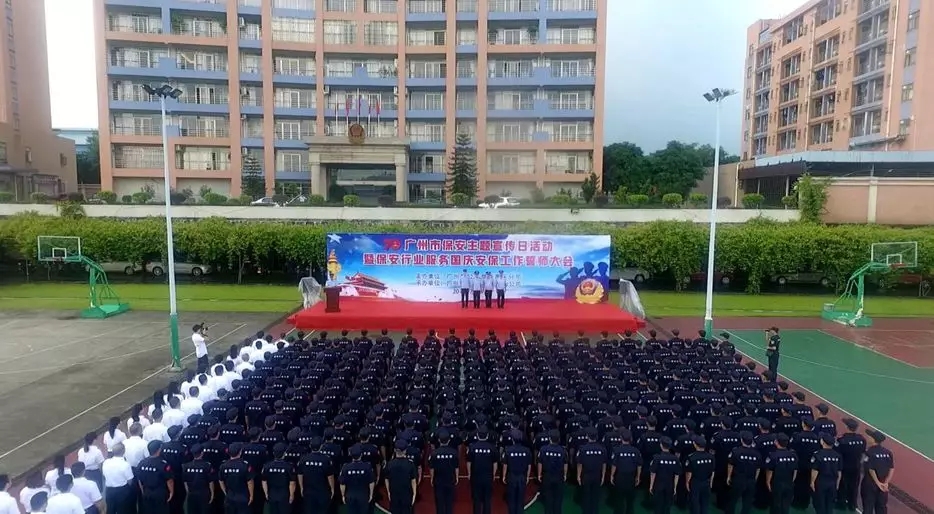 隨著大會主持溫遠(yuǎn)峰宣布大會開始,誓師大會在雄壯的國歌聲中拉開序幕。番禺區(qū)保安服務(wù)公司5個片區(qū)、1個機(jī)動大隊(duì)共300余人隊(duì)列嚴(yán)整,精神抖擻,彰顯了保安隊(duì)伍良好的精神風(fēng)貌和高昂斗志,表明全體保安員打贏國慶70周年安保的堅定決心。