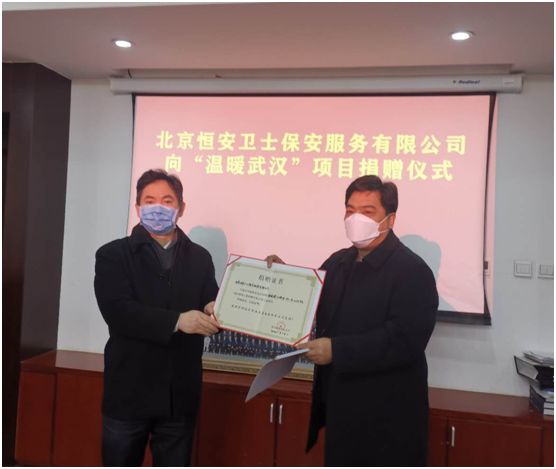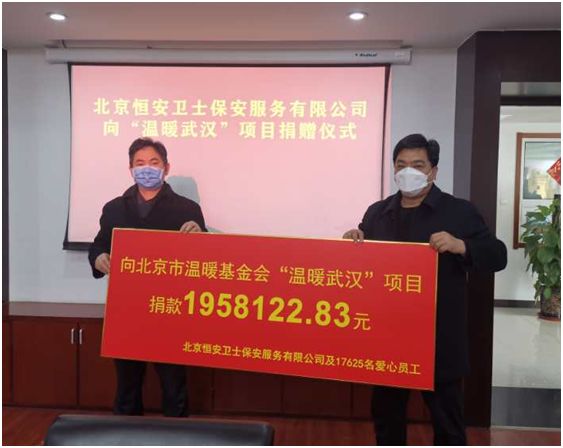 2020年3月9日,北京恒安衛(wèi)士保安服務(wù)有限公司將企業(yè)和17625名愛心員工共計(jì)1958122.83元的善款捐贈至北京市溫暖基金會,通過溫暖基金會表達(dá)對武漢市抗疫一線醫(yī)務(wù)工作者、公安干警和保安兄弟的崇高敬意。