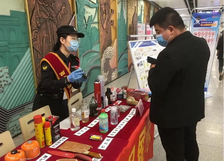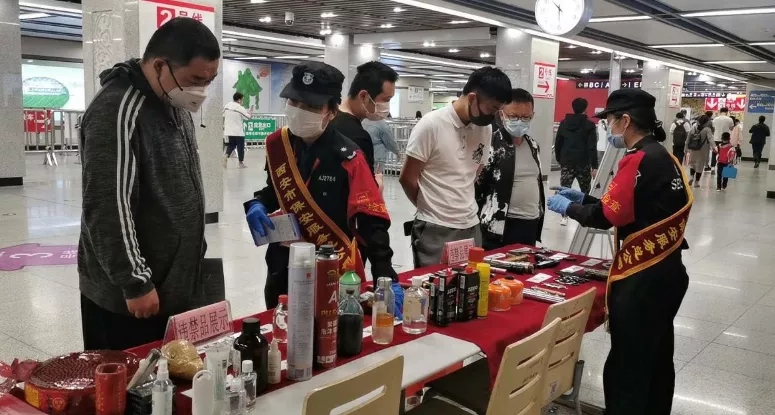 其中,宣傳展板通過圖文并茂的方式重點展示了軌道交通禁止攜帶物品目錄、安檢政策法規(guī)及地鐵安檢典型案例,在展示桌上擺放了地鐵開通以來安檢查出的違禁品,其中包括各類警用器具、管制刀具、易燃易爆、有毒有害、腐蝕性物品及其他危害公共安全的常見違禁品實物?;顒蝇F(xiàn)場還設(shè)置了咨詢臺,向乘客發(fā)放城市軌道交通條例、違禁品目錄、新冠肺炎防控等宣傳材料,并解答乘客提出的安檢相關(guān)問題。