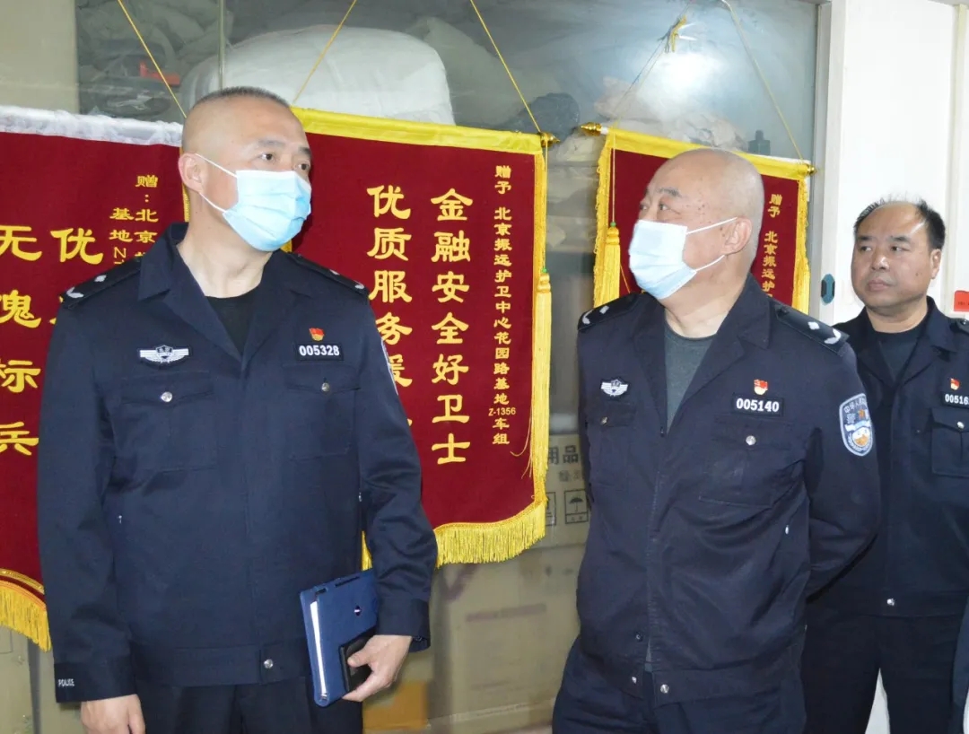 4月28日,北京市公安局內(nèi)部單位保衛(wèi)局副局長魏民在北京振遠(yuǎn)護衛(wèi)中心總經(jīng)理楊新平、北京開遠(yuǎn)保安公司經(jīng)理劉伯元、文安保安公司經(jīng)理郝宗芬的陪同下,來到振遠(yuǎn)第十二支隊花園路基地檢查指導(dǎo)疫情防控工作,并看望慰問基地一線押運隊員。