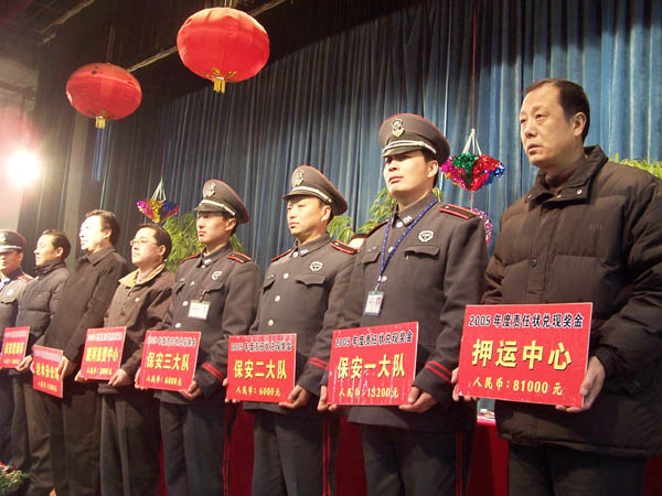 元月22日上午,總公司隆重召開“責(zé)任狀兌現(xiàn)暨春節(jié)安保工作會議”,會議對完成2005年任務(wù)指標(biāo)的9個部門受狀人頒發(fā)了責(zé)任狀獎金,并對春節(jié)安全保衛(wèi)工作作了部署。武裝押運中心、保安大隊及各部門300余人參加了會議。