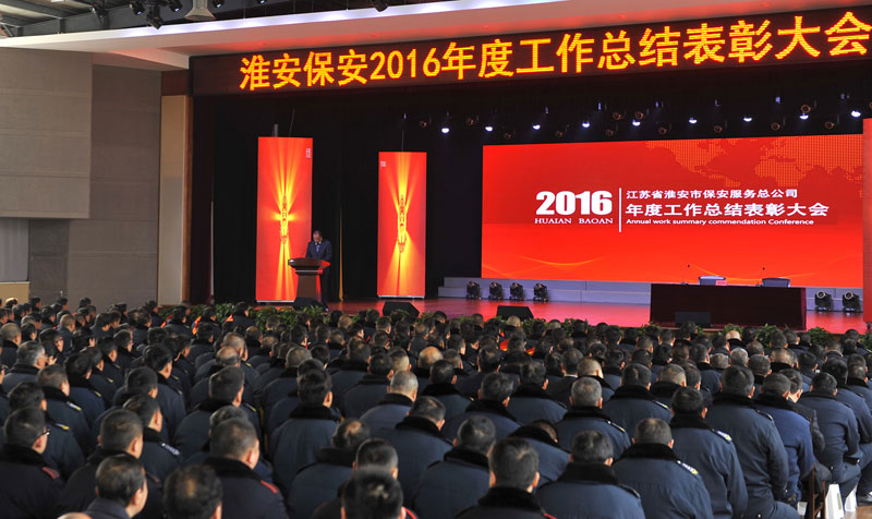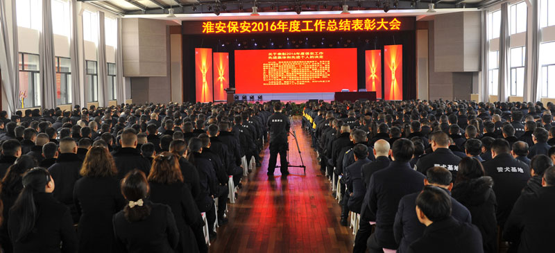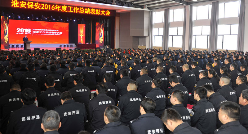 2017年2月26日上午,淮安保安服務(wù)總公司在活動中心召開了2016年度工作總結(jié)表彰大會,總公司保安隊伍分隊長以上骨干和保安員代表、押運隊伍市區(qū)押運員和駐各縣隊員代表、各分公司員工代表、行政中心各部門人員以及保安中專班學(xué)員共計近800人參加了會議。
