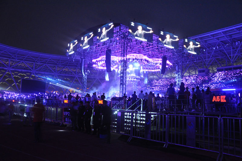 5月5日,“A CLASSIC TOUR學(xué)友·經(jīng)典世界演唱會(huì)”揚(yáng)州站,以人防中心王錦春總監(jiān)為領(lǐng)導(dǎo)管理班子,積極與主辦方聯(lián)絡(luò),在演唱會(huì)前一天,組織精干管理人員踏勘現(xiàn)場(chǎng),提出合理化安保建議,精心組織崗位分配,各項(xiàng)前期準(zhǔn)備工作有條不紊地開(kāi)展。5日上午10時(shí),第一批100名大型活動(dòng)特勤安保隊(duì)伍進(jìn)駐揚(yáng)州體育公園,下午16時(shí),100名專業(yè)安檢員和特勤隊(duì)員準(zhǔn)時(shí)到達(dá)各預(yù)定崗位開(kāi)展工作。在整場(chǎng)演唱會(huì)活動(dòng)中,安檢崗位中查獲各類違禁品5000余件。因主辦方設(shè)定預(yù)檢票口位置較少,造成大量觀眾聚集,我們合理調(diào)集機(jī)動(dòng)隊(duì)伍認(rèn)真做好人員疏散工作,避免了事故隱患。