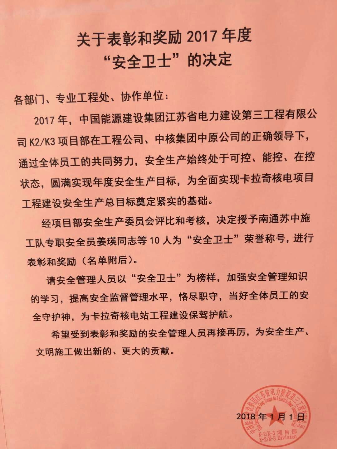 2018年第一天,總公司駐巴基斯坦卡拉奇執(zhí)勤點(diǎn)保安員受到中國能源建設(shè)集團(tuán)江蘇省電力建設(shè)第三工程有限公司K2/K3項(xiàng)目部的表彰和獎(jiǎng)勵(lì),仲飛榮獲“安全生產(chǎn)優(yōu)秀管理者”稱號;萬龍虎、張勇、陳素建、徐浩、呂志標(biāo)、劉軍等6名安全員榮獲“安全衛(wèi)士”稱號。