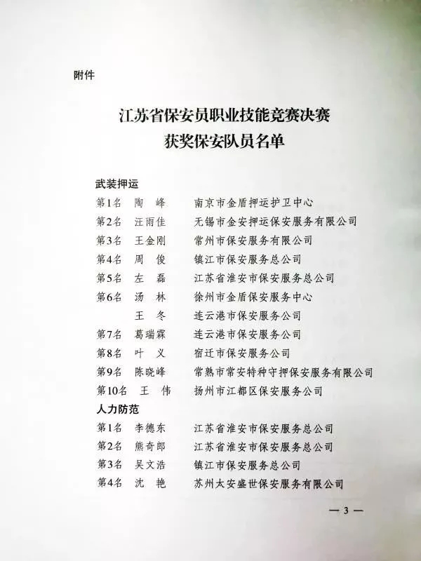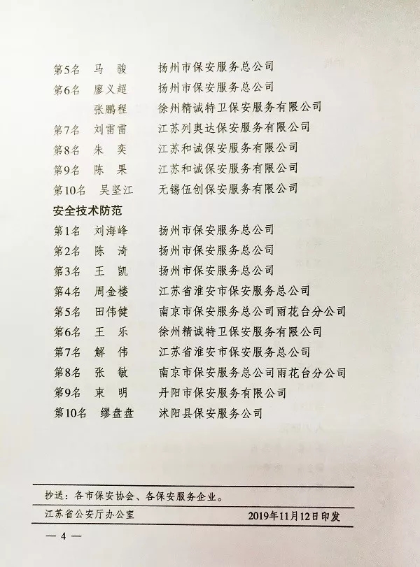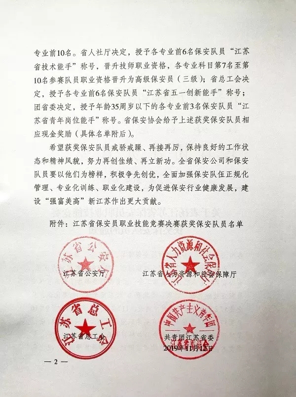11月12日,江蘇省公安廳、江蘇省人力資源和社會(huì)保障廳、江蘇省總工會(huì)、共青團(tuán)江蘇省委聯(lián)合發(fā)文,祝賀、表?yè)P(yáng)獲獎(jiǎng)保安員,并對(duì)各科目進(jìn)入前六名的獲獎(jiǎng)人員分別授予“江蘇省技術(shù)能手”、“江蘇省五一創(chuàng)新能手”和“江蘇省青年崗位能手”榮譽(yù)稱(chēng)號(hào)。