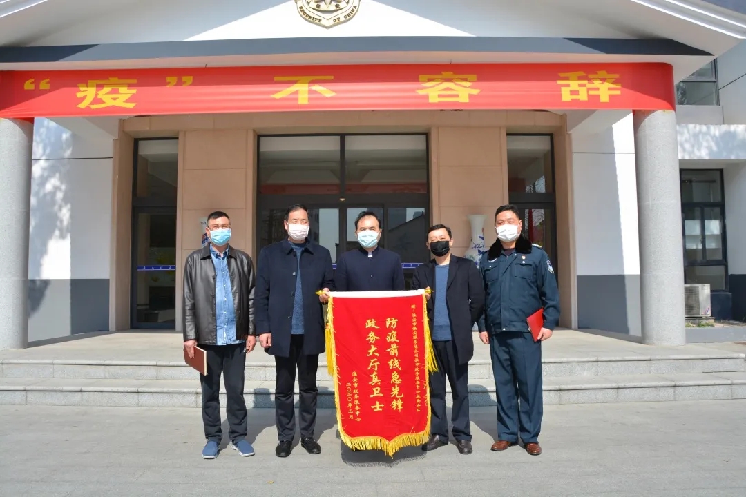 3月17日上午,淮安市行政審批局副局長丁永祥,辦公室主任劉亞明專程來到總公司對在疫情期間派駐在政務(wù)中心的保安員們辛勤付出送上錦旗和感謝信,總公司副總經(jīng)理王錦春陪同。