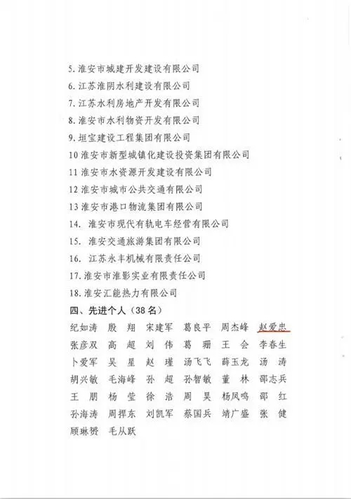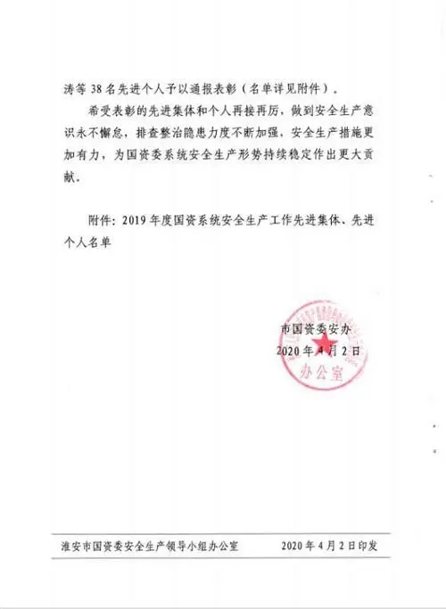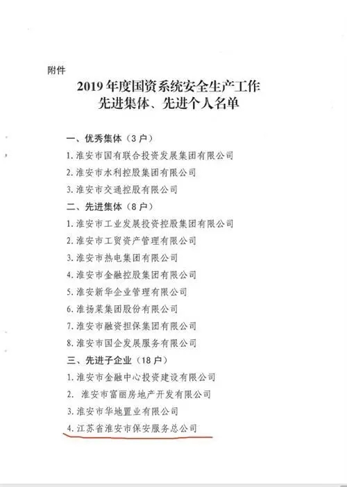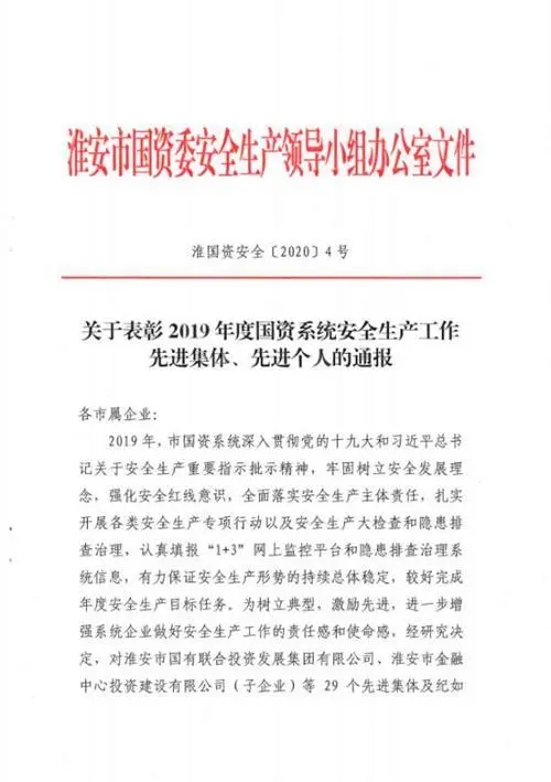2020年4月2日,淮安市國資委通報表揚2019年度國資系統(tǒng)安全生產先進集體和個人,淮安保安以“零事故”“零隱患”表現(xiàn)榮膺先進集體。公司黨總支書記、總經理趙愛忠榮膺先進個人。